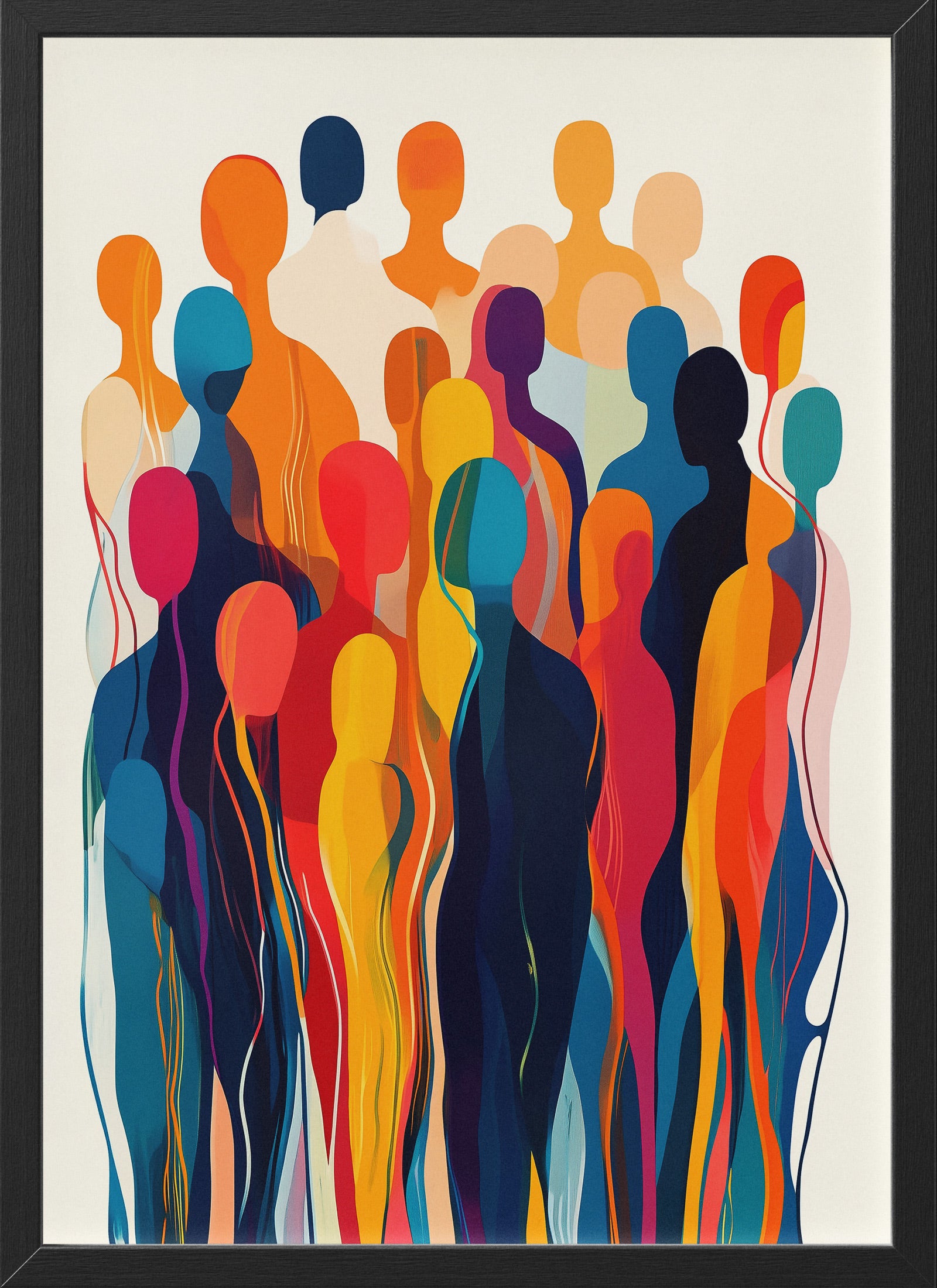 This expressive poster showcases a vibrant crowd of abstract human silhouettes—each figure formed with fluid lines and vivid hues. It evokes unity, individuality, and energy all at once, making it a powerful piece for modern interiors.