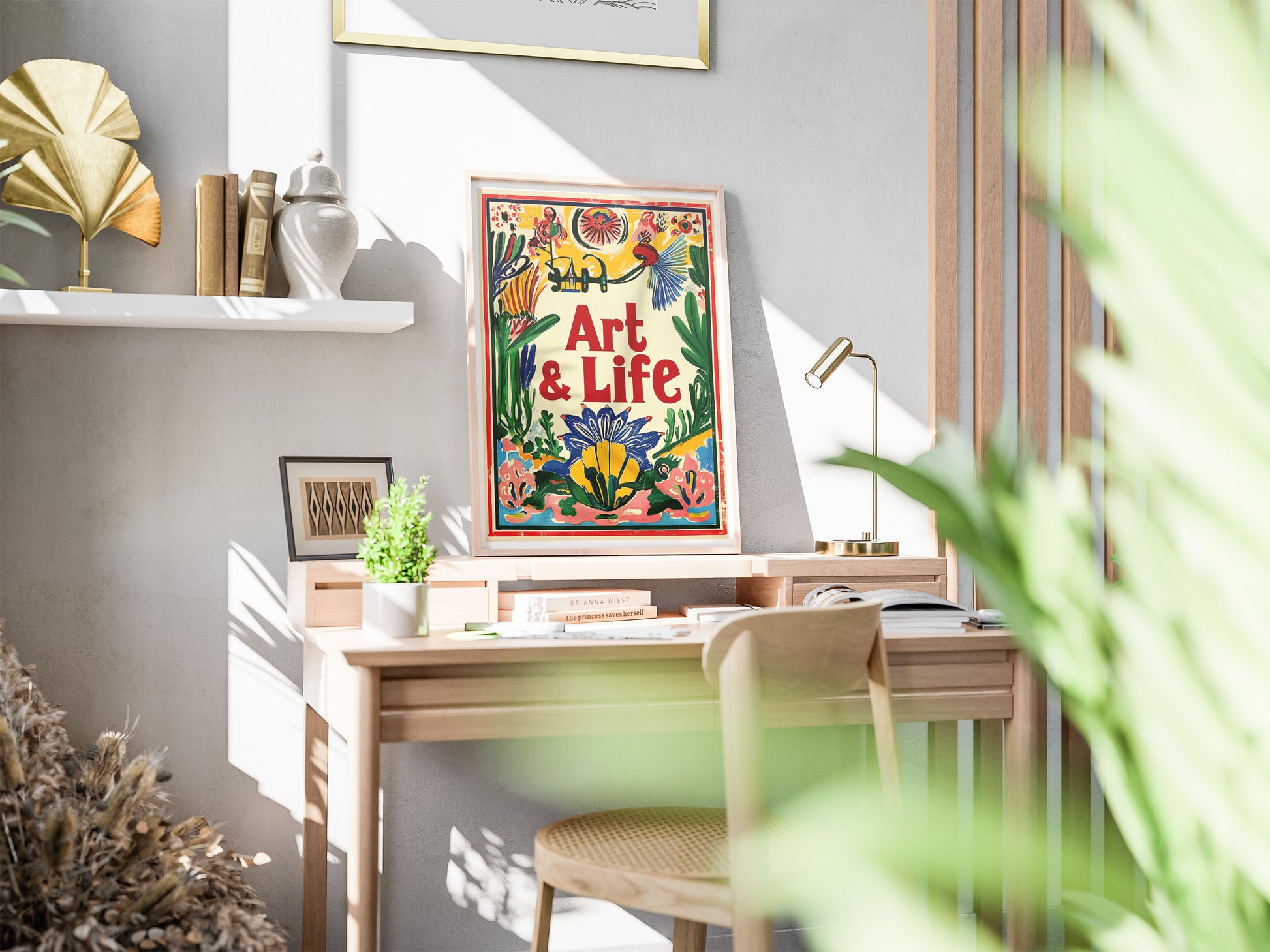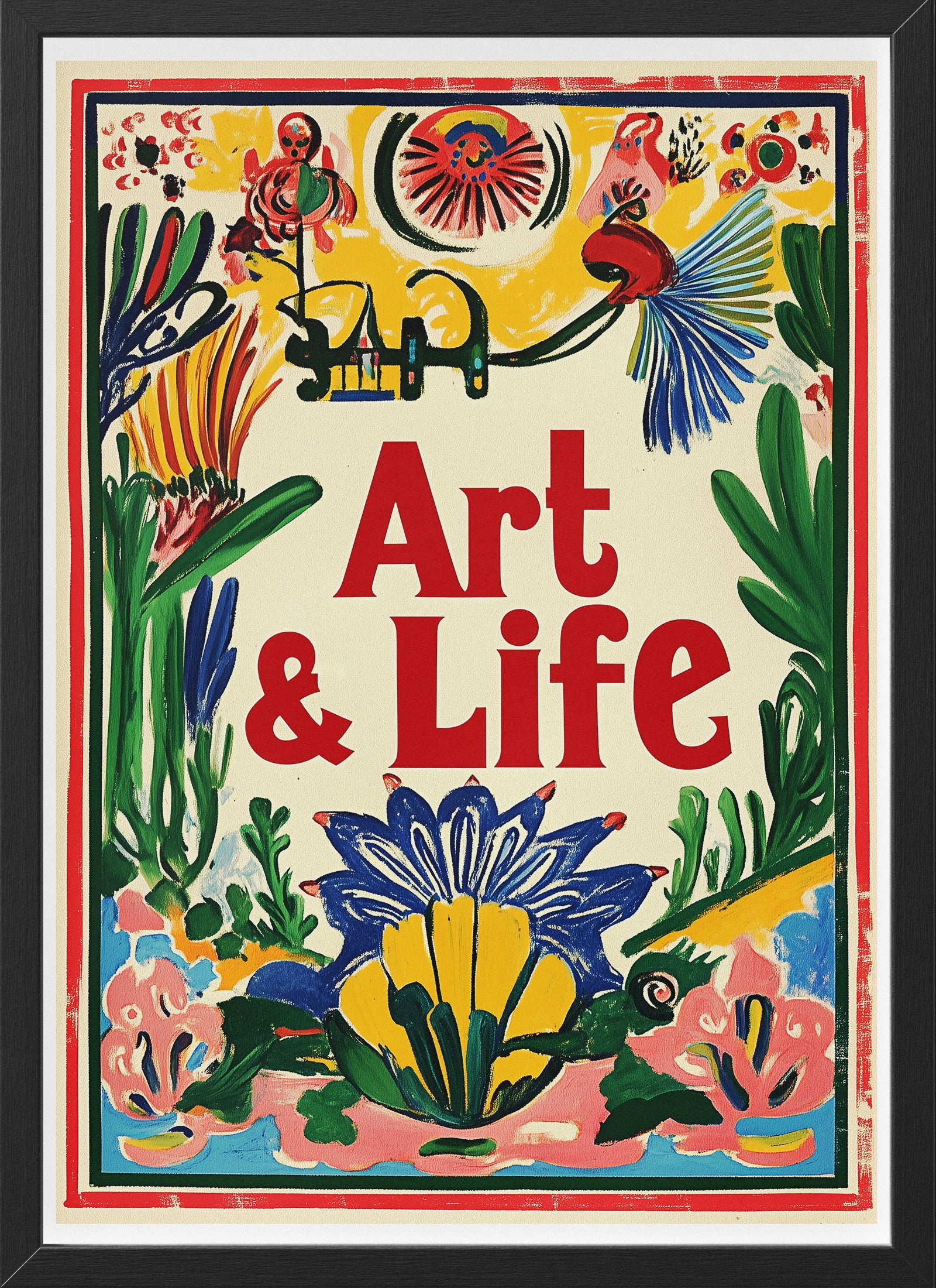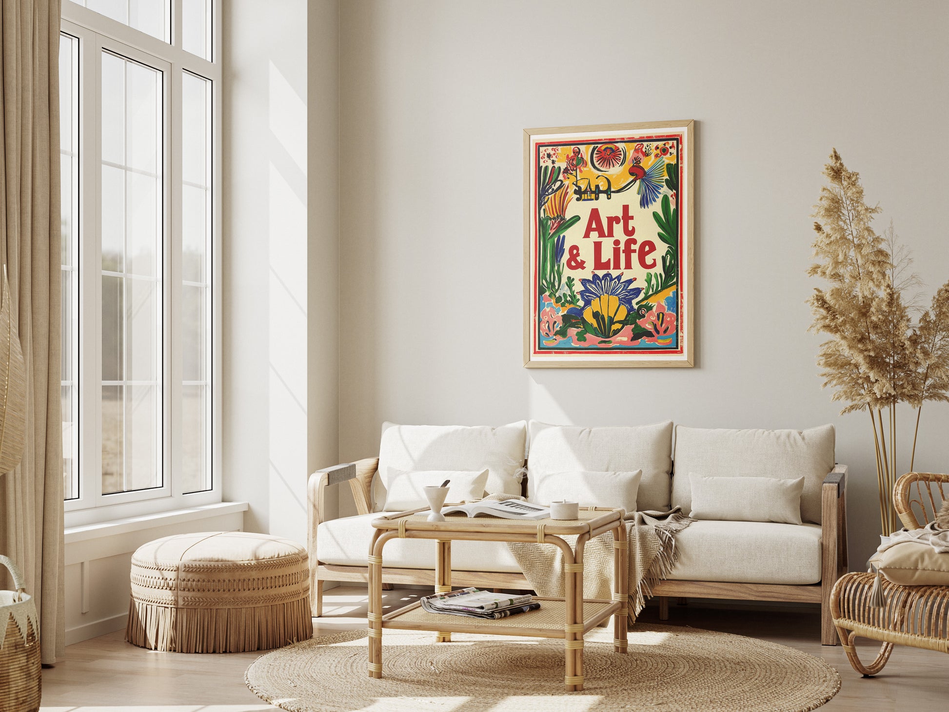 Celebrate the joy of creativity with this folk-inspired “Art & Life” poster—where blooming florals meet vintage typography in a lively explosion of color. Blending bohemian charm and retro warmth, this design captures the essence of living artfully.