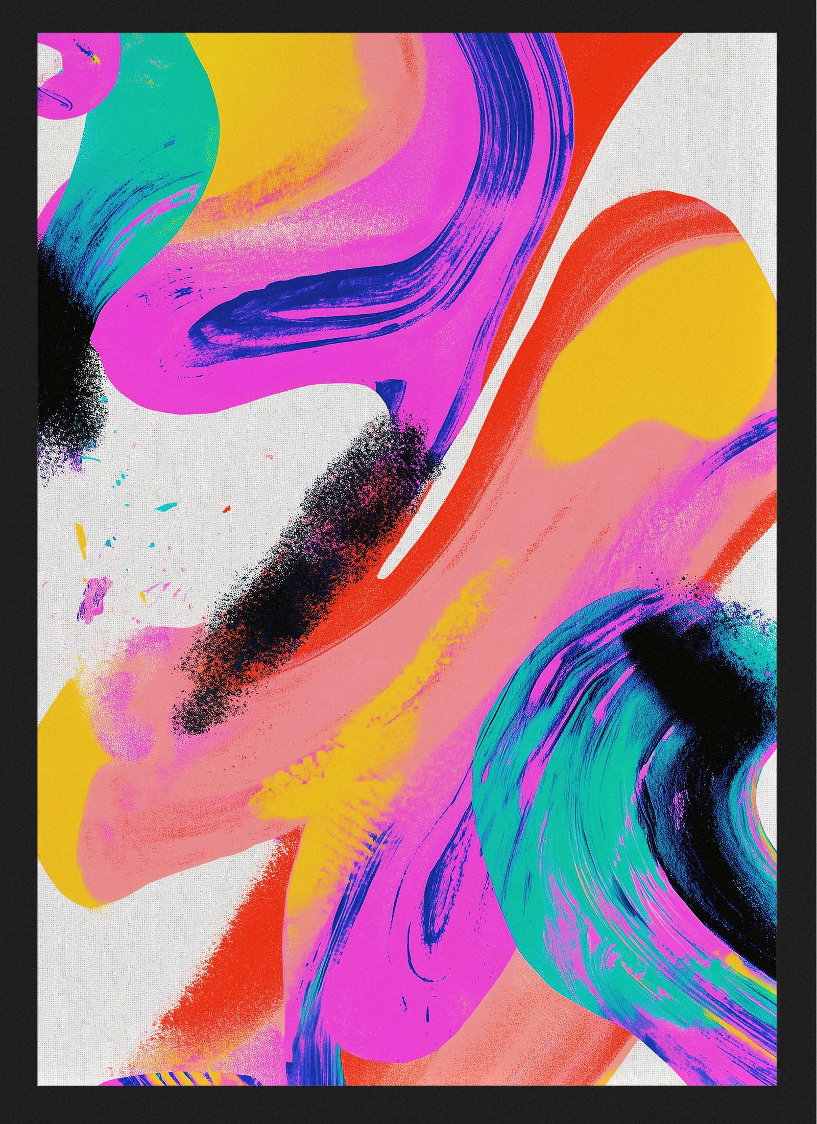Turn your space into an expressive masterpiece with this vibrant brushstroke print. Featuring energetic swirls of neon pink, teal, yellow, and black, this artwork is ideal for those who crave a splash of energy in their decor.
