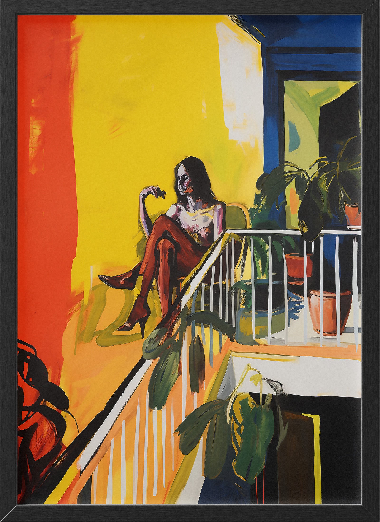 This expressive artwork captures a woman in a quiet, introspective moment—rendered in vivid colors and confident brushwork. The piece blends abstract realism with figurative emotion, spotlighting the raw beauty of solitude, space, and female presence. Inspired by modern Australian art sensibilities, this print brings painterly impact and atmosphere to any room.