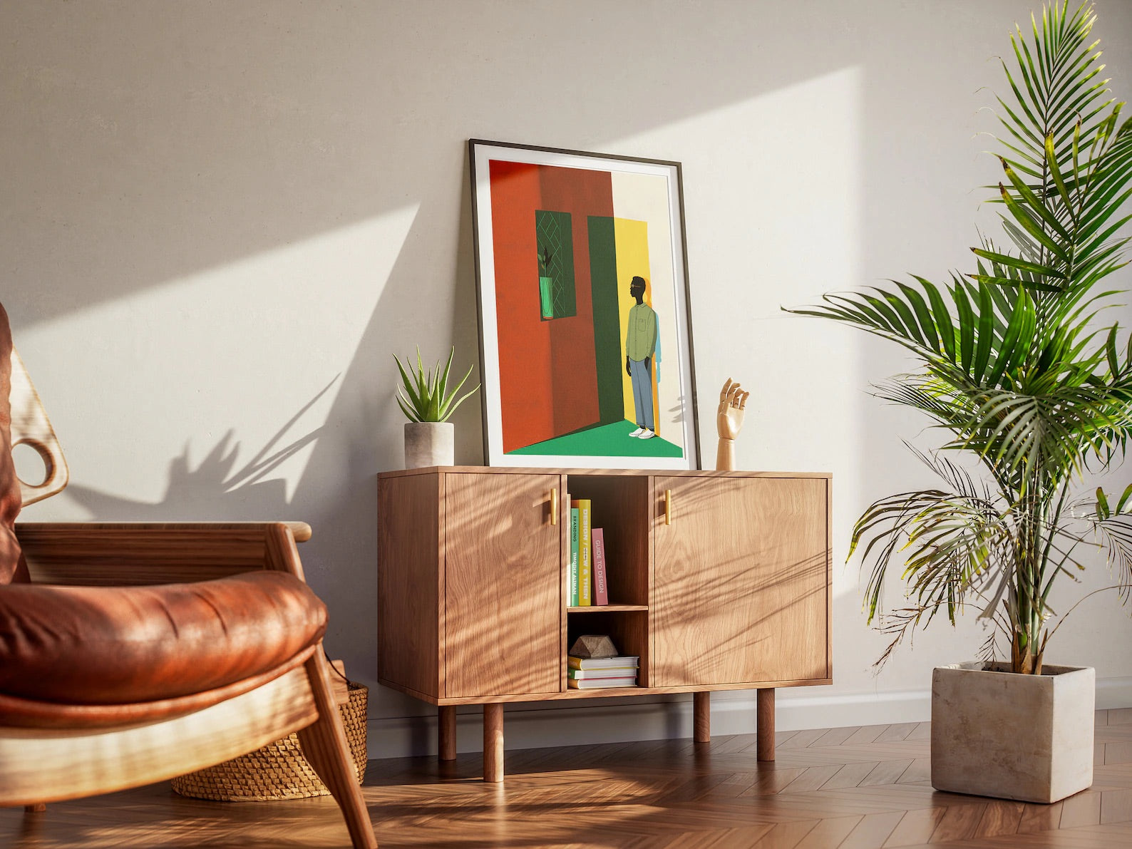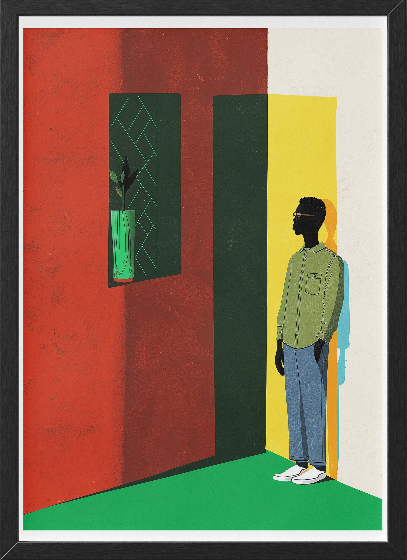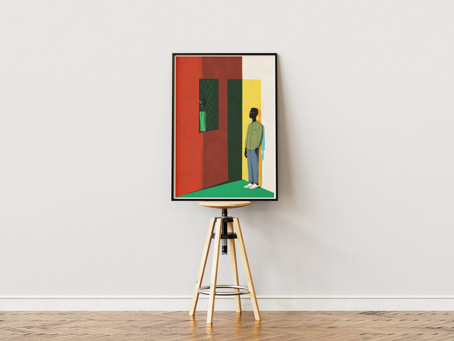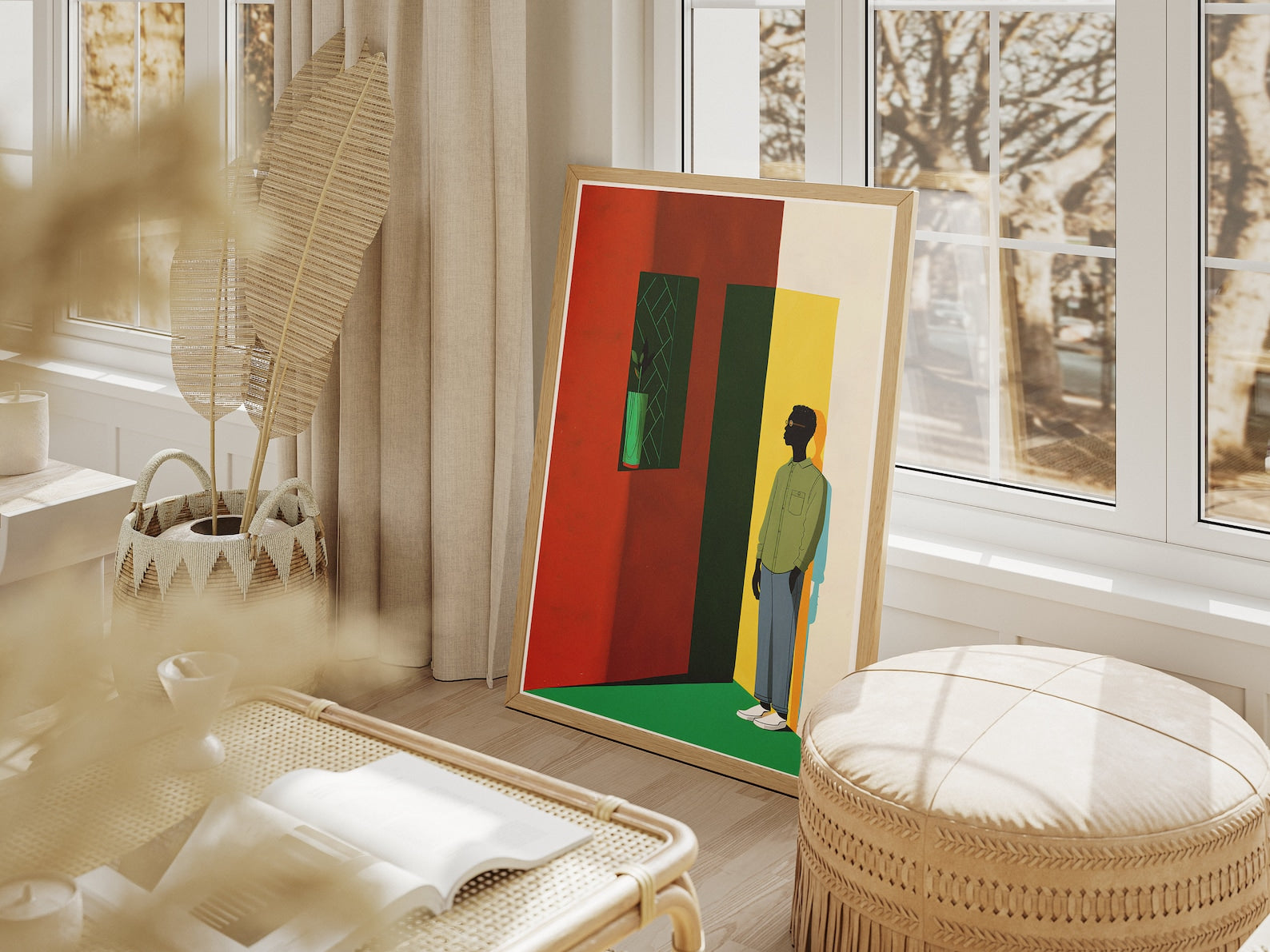Add a modern and reflective tone to your space with this minimalist African American figure poster. Clean lines, warm color blocks, and subtle symbolism create a sense of thoughtfulness — perfect for bedrooms, offices, or art-focused interiors.